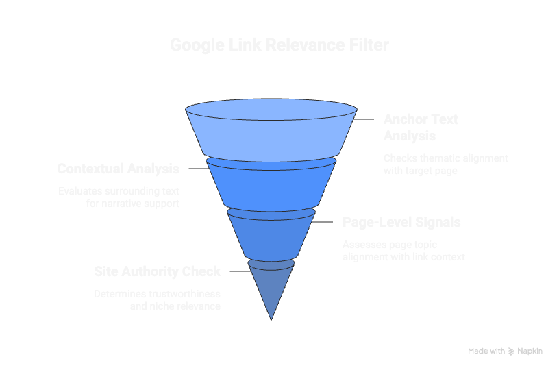 If a link about “machine learning algorithms” sits on a page discussing “best breakfast recipes,” Google knows something is off. The page context contradicts the link context.